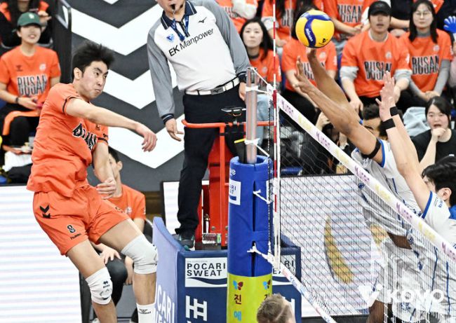 [서울=뉴시스] 남자 프로배구 OK저축은행 차지환이 17일 부산강서체육관에서 열린 진에어 2025~2026 V-리그 남자부 삼성화재와의 경기에서 공격을 시도하고 있다. (사진=KOVO 제공) 2026.01.17. [서울=뉴시스]문채현 기자 = 베테랑 감독과 초보 감독대행의 맞대결에선 치열한 승부에선 관록이 승리했다. OK저축은행은 17일 부산강서체육관에서