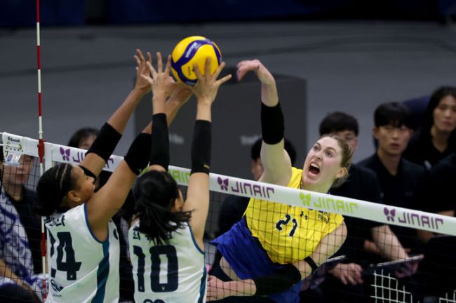 [서울=뉴시스] 3일 수원실내체육관에서 열린 젠에어 2025-2026 V-리그 프로배구대회 현대건설과 GS칼텍스의 경기, 현대건설 카리가 공격하고 있다. (사진=현대건설 배구단 제공) 2026.01.03. photo@newsis.com *재판매 및 DB 금지 [서울=뉴시스]문채현 기자 = 시즌 초반 우승 후보로 거론되지 않았던 여자 프로배구 현대건설이 선두