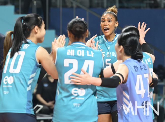 20일 서울 장충체육관에서 '2025-2026 V-리그 여자부' GS칼텍스와 정관장 경기가 열렸다. GS칼텍스가 실바의 서브에이스에 기뻐하고 있다.