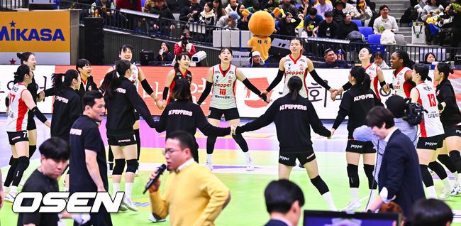 6위 페퍼저축은행이 2위 현대건설을 제압하고 전반기를 마무리했다. 페퍼저축은행은 21일 수원실내체육관에서 열린 진에어 2025~2026 V-리그 현대건설을 상대로 3-1(23-25, 25-15, 25-16, 25-19) 역전승을 거뒀다. 경기종료 후 페퍼저축은행 선수들이 승리의 기쁨을 나누고 있다. 2026.01.21 / soul1014@osen.co.kr