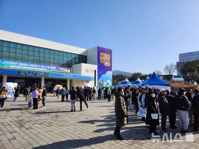 [춘천=뉴시스] 박윤서 기자 = 진에어 2025~2026 V-리그 올스타전이 열리는 체육관 밖에서 팬들이 북새통을 이뤘다. 2026.01.25. [춘천=뉴시스]박윤서 기자 = 2년 만에 열리는 프로배구 올스타전이 뜨거운 열기를 내뿜었다. 진에어 2025~2026 V-리그 올스타전은 25일 오후 3시 강원도 춘천 호반체육관에서 열린다. 한국배구연맹(KOVO)