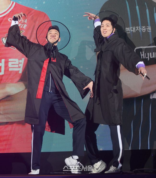 신영석(왼쪽)과 최민호가 25일 춘천 호반체육관에서 열린 2025-2026 V-리그 올스타전에서 사자보이스 복장으로 입장하고 있다. 2026. 1. 25. 춘천 | 최승섭기자 thunder@sportsseoul.com [기사제보 news@sportsseoul.com] Copyright ⓒ 스포츠서울&sportsseoul.com