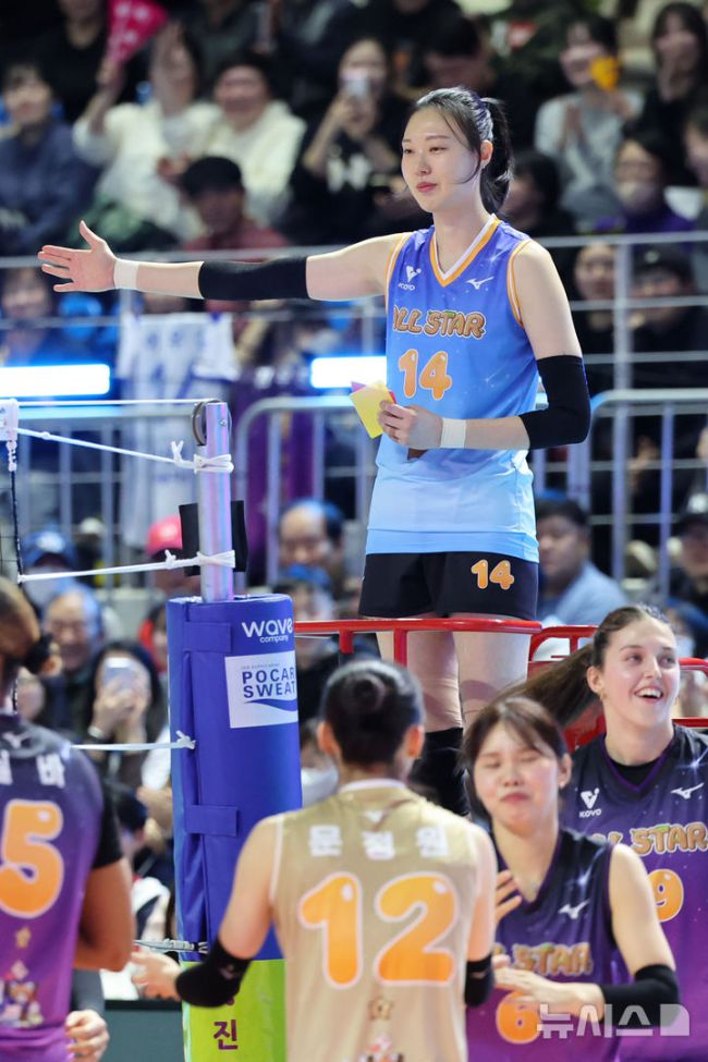 [춘천=뉴시스] 권창회 기자 = 25일 강원 춘천시 호반체육관에서 열린 진에어 2025~2026 V-리그 올스타전에서 K-스타 양효진이 심판을 보며 V-스타 선수들에게 항의를 받고 있다. 2026.01.25. kch0523@newsis.com [춘천=뉴시스]박윤서 기자 = 여자 프로배구 현대건설의 간판스타 양효진이 은퇴와 관련된 질문에 "조만간 결정할 것"