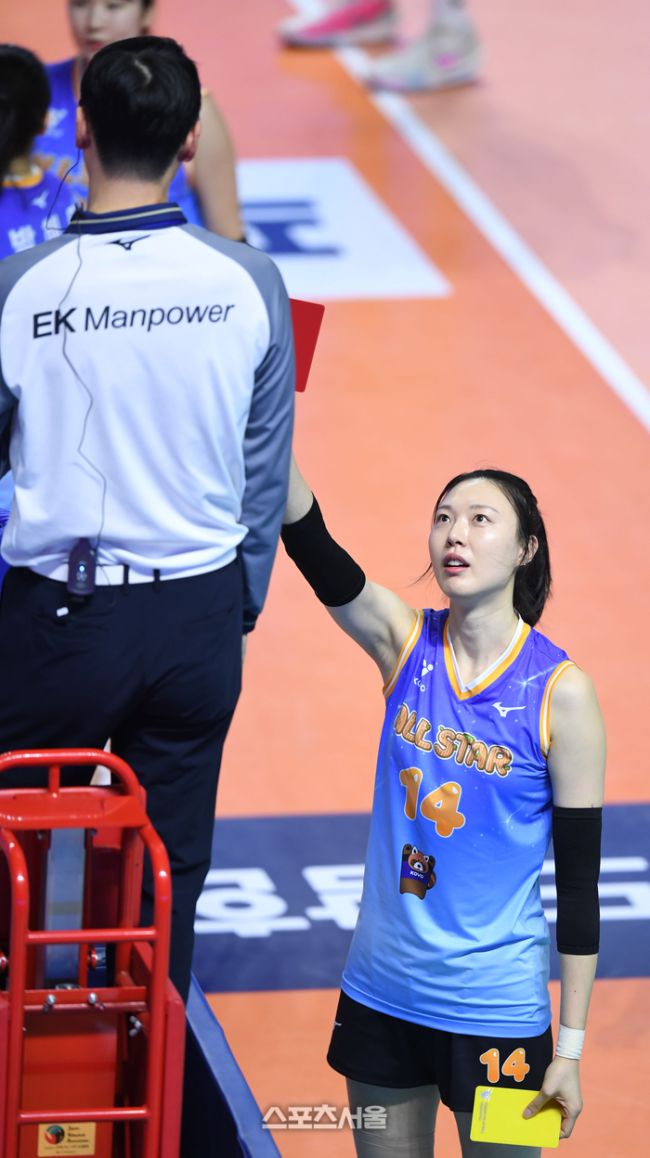 양효진이 25일 춘천 호반체육관에서 열린 2025-2026 V-리그 올스타전에서 송인섭 주심에 레드카드를 주고 있다. 2026. 1. 25.춘천 | 최승섭기자 thunder@sportsseoul.com “조만간 결정하겠다.” 양효진은 25일 강원도 춘천 호반체육관에서 열린 진에어 2025~2026 V리그 올스타전에서 여자부 MVP를 거머쥐었다. 기자단 투표