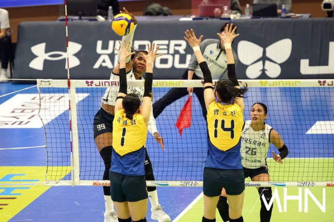 24일 경기도 수원실내체육관에서 '진에어 2025~2026 V-리그' 여자부 6라운드 현대건설(2위 56점 19승 11패)과 한국도로공사(1위 59점 21승 9패) 경기가 열렸다. 3연패에 빠진 한국도로공사가 부진한 틈을 타 현대건설은 4연승을 질주하며 맹추격하고 있다. 모마가 경기를 펼치고 있다.