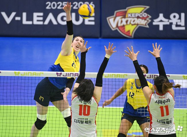 8일 오후 경기도 수원실내체육관에서 열린 '진에어 2025-2026 V-리그' 현대건설과 페퍼저축은행의 경기, 현대건설 카리가 공격을 시도하고 있다. 고아라 기자 iknow@xportsnews.com