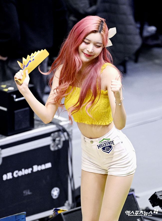 8일 오후 경기도 수원실내체육관에서 열린 '진에어 2025-2026 V-리그' 현대건설과 페퍼저축은행의 경기, 신혜령 치어리더가 열띤 응원을 펼치고 있다. 고아라 기자 iknow@xportsnews.com