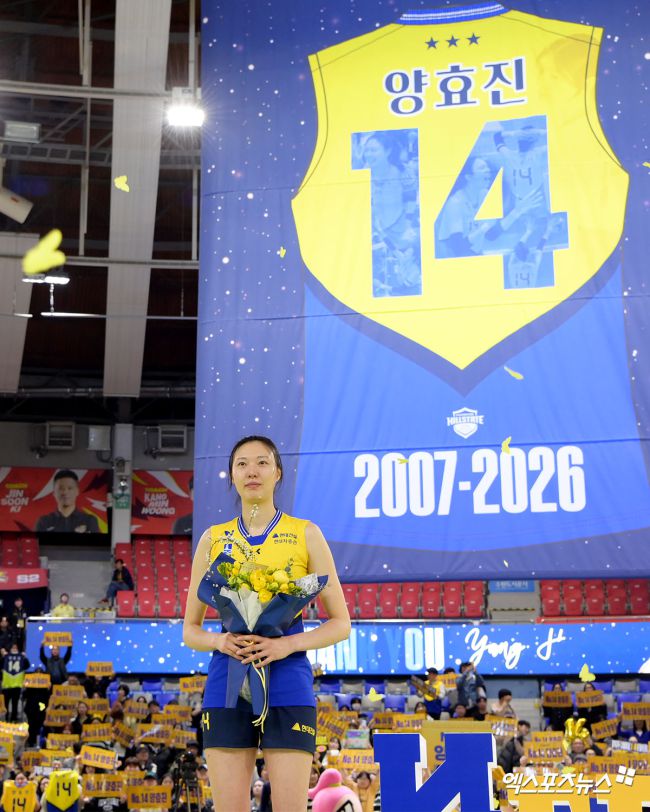 8일 오후 경기도 수원실내체육관에서 열린 '진에어 2025-2026 V-리그' 현대건설과 페퍼저축은행의 경기, 현대건설 양효진의 은퇴식 및 14번 영구결번식이 진행됐다. 고아라 기자 iknow@xportsnews.com