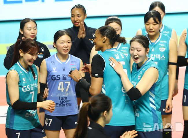 [서울=뉴시스] 황준선 기자 = 18일 서울 중구 장충체육관에서 열린 2025-2026 V-리그 여자부 현대건설 힐스테이트 배구단과 GS칼텍스 서울KIXX의 경기, 세트스코어 3-0으로 승리하며 준플레이오프 진출을 확정지은 GS칼텍스 선수들이 자축하고 있다. 2026.03.18. hwang@newsis.com [사진 영상 제보받습니다] 공감언론 뉴시스가 독