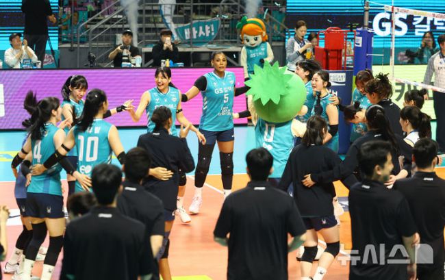[서울=뉴시스] 황준선 기자 = 18일 서울 중구 장충체육관에서 열린 2025-2026 V-리그 여자부 현대건설 힐스테이트 배구단과 GS칼텍스 서울KIXX의 경기, 세트스코어 3-0으로 승리하며 준플레이오프 진출을 확정지은 GS칼텍스 선수들이 자축하고 있다. 2026.03.18. hwang@newsis.com [사진 영상 제보받습니다] 공감언론 뉴시스가 독