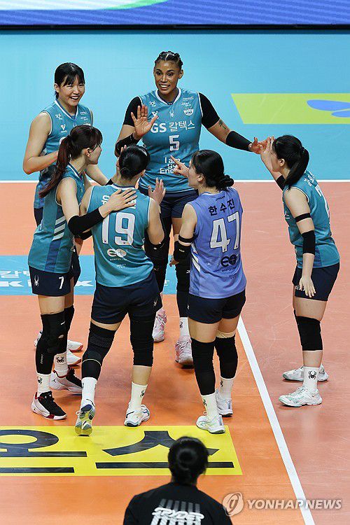 (서울=연합뉴스) 서대연 기자 = 24일 서울 중구 장충체육관에서 열린 프로배구 2025-2026 V-리그 포스트시즌 여자부 준플레이오프 GS칼텍스와 흥국생명의 경기. GS칼텍스 선수들이 득점한 뒤 기뻐하고 있다. 2026.3.24 dwise@yna.co.kr ▶제보는 카카오톡 okjebo ▶연합뉴스 앱 지금 바로 다운받기~ ▶네이버 연합뉴스 채널 구독하기