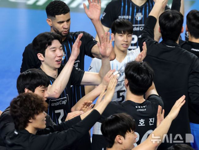 [천안=뉴시스] 홍효식 기자 = 27일 충남 천안 유관순체육관에서 열린 2025-2026 V-리그 남자부 플레이오프 1차전 현대캐피탈과 우리카드의 경기, 세트스코어 3-2로 승리한 현대캐피탈 허수봉 등 선수들이 기뻐하고 있다. 2026.03.27. yesphoto@newsis.com [사진 영상 제보받습니다] 공감언론 뉴시스가 독자 여러분의 소중한 제보를