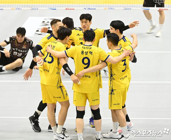 6일 오후 경기도 의정부실내체육관에서 열린 ‘도드람 2023-2024 V-리그’ KB손해보험과 OK금융그룹의 경기, KB손해보험 선수들이 득점 후 기뻐하고 있다. 김한준 기자 kowel@xportsnews.com