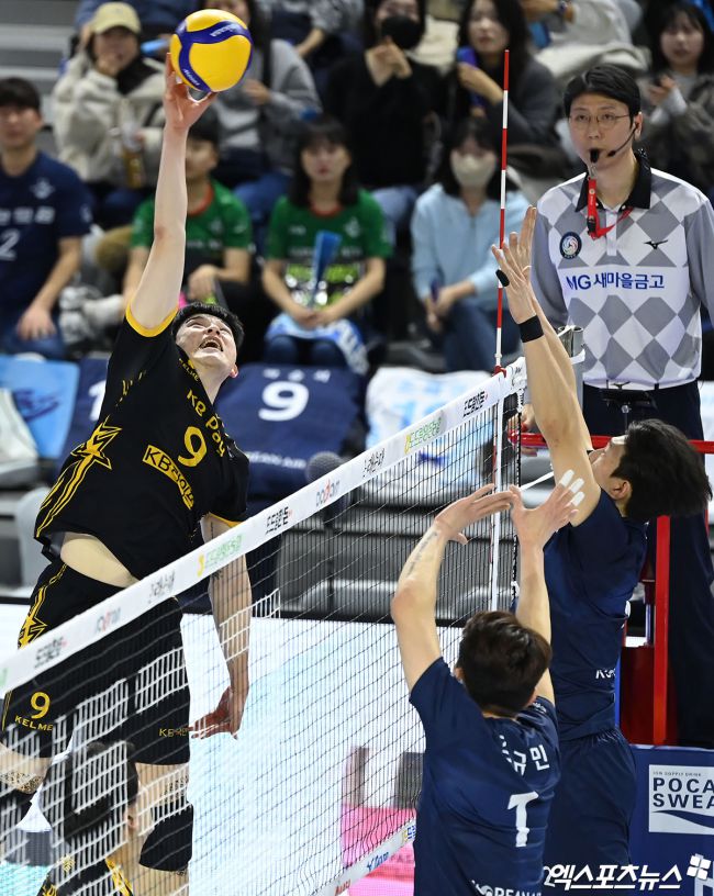 10일 오후 인천 계양체육관에서 열린 ‘도드람 2023-2024 V-리그’ 대한항공과 KB손해보험의 경기, KB손해보험 홍상혁이 공격을 시도하고 있다. 김한준 기자 kowel@xportsnews.com