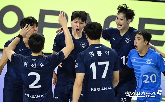 10일 오후 인천 계양체육관에서 열린 ‘도드람 2023-2024 V-리그’ 대한항공과 KB손해보험의 경기, 대한항공 정한용이 득점 후 기뻐하고 있다. 김한준 기자 kowel@xportsnews.com