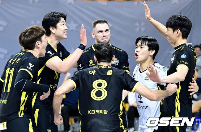 5일 오후 경기도 의정부시 경민대학교 체육관에서 ‘도드람 2024-2025 V-리그’ 남자부 KB손해보험과 현대캐피탈의 경기가 열렸다.홈팀 KB손해보험이 세트 스코어 3-0(25-18 25-20 25-21)로 현대캐피탈의 17연승을 저지하며 의정부 팬들에게 승리를 안겼다.3세트 막판 KB손해보험 선수들이 득점에 기뻐하고 있다. 2025.02.05 / dre