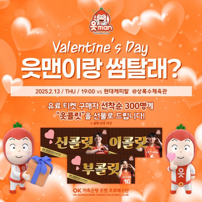 남자프로배구 OK저축은행이 13일 안산 상록수체육관에서 열리는 도드람 2024-2025 V-리그 남자부 5라운드 현대캐피탈과의 홈경기에서 팬들을 위한 특별한 선물을 준비했다. 우선 13일 상록수체육관을 찾는 유료 관중 선착순 300명에게는 발렌타인데이를 앞두고 팬들에게 특별한 초콜릿을 선물한다. 선수들의 사진이 들어간 '읏콜릿'으로, 이민규·신호진·부용찬