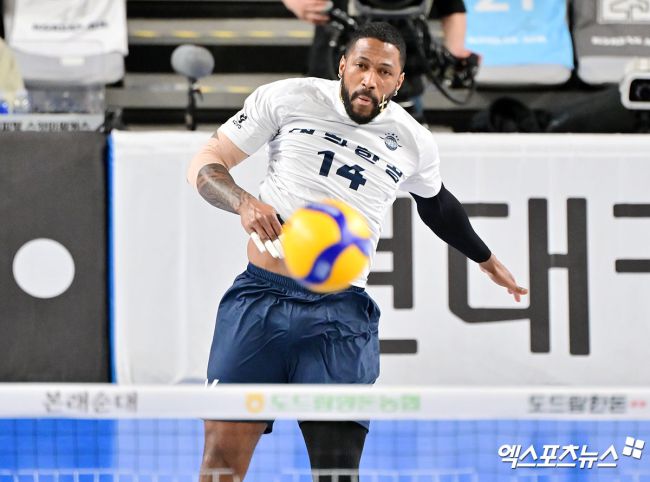 18일 오후 충남 천안유관순체육관에서 열린 ‘도드람 2024-2025 V-리그’ 현대캐피탈과 대한항공의 경기, 대한항공 요스바니가 서브를 시도하고 있다. 김한준 기자 kowel@xportsnews.com