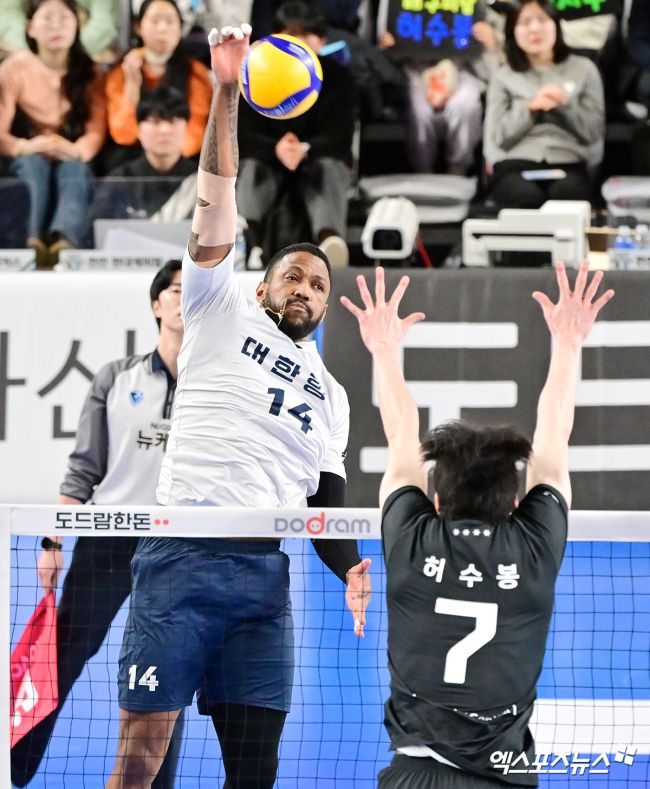 18일 오후 충남 천안유관순체육관에서 열린 ‘도드람 2024-2025 V-리그’ 현대캐피탈과 대한항공의 경기, 대한항공 요스바니가 공격을 시도하고 있다. 김한준 기자 kowel@xportsnews.com