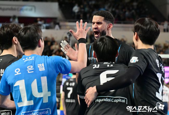 1일 오후 충남 천안유관순체육관에서 열린 ‘도드람 2024-2025 V-리그’ 현대캐피탈과 대한항공의 챔피언결정전 1차전 경기, 현대캐피탈 레오가 득점 후 기뻐하고 있다. 김한준 기자 kowel@xportsnews.com