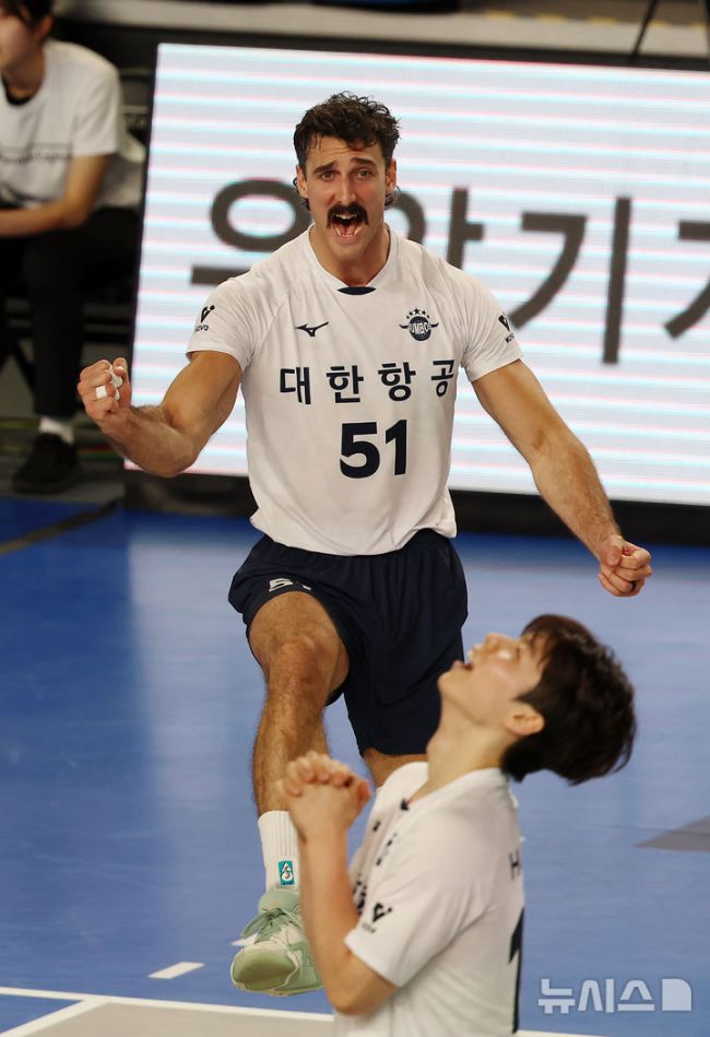 [천안=뉴시스] 김명년 기자 = 1일 오후 충남 천안시 유관순체육관에서 열린 2024-2025 V-리그 남자부 챔피언결정전 1차전 현대캐피탈과 대한항공의 경기, 대한항공 러셀이 득점 후 기뻐하고 있다. 2025.04.01. kmn@newsis.com [사진 영상 제보받습니다] 공감언론 뉴시스가 독자 여러분의 소중한 제보를 기다립니다. 뉴스 가치나 화제성이