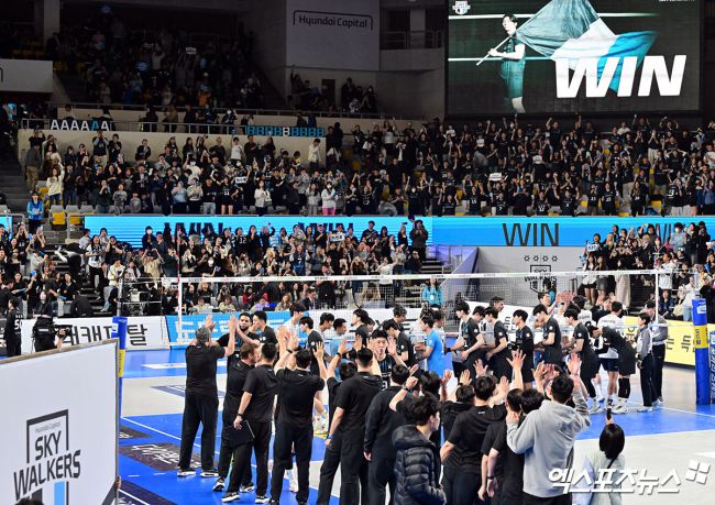 1일 오후 충남 천안유관순체육관에서 열린 ‘도드람 2024-2025 V-리그’ 현대캐피탈과 대한항공의 챔피언결정전 1차전 경기, 현대캐피탈이 대한항공에 세트 스코어 3:1(25-20, 24-26, 25-22, 25-23) 승리를 거뒀다. 이날 경기에서 승리한 현대캐피탈 선수들이 기뻐하고 있다. 김한준 기자 kowel@xportsnews.com