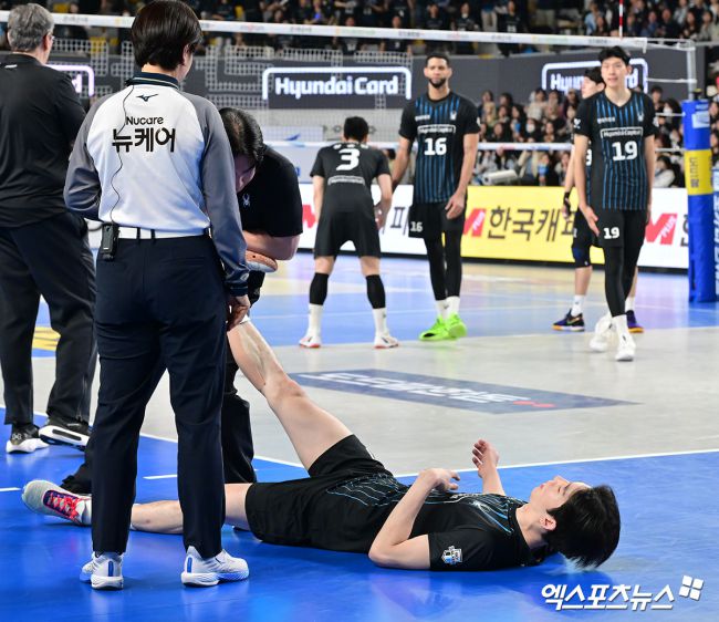 1일 오후 충남 천안유관순체육관에서 열린 ‘도드람 2024-2025 V-리그’ 현대캐피탈과 대한항공의 챔피언결정전 1차전 경기, 현대캐피탈이 대한항공에 세트 스코어 3:1(25-20, 24-26, 25-22, 25-23) 승리를 거뒀다. 현대캐피탈 허수봉이 경련으로 치료를 받고 있다. 김한준 기자 kowel@xportsnews.com
