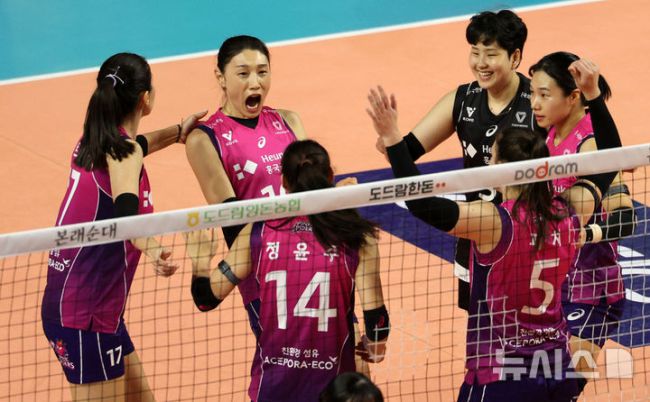 [인천=뉴시스] 고범준 기자 = 31일 인천 부평구 삼산월드체육관에서 열린 2024~2025 V-리그 여자부 챔피언결정전(5전 3선승제) 1차전 흥국생명 핑크스파이더스와 정관장 레드스파크스의 경기, 흥국생명 김연경이 공격에 성공하자 기뻐하고 있다. 2025.03.31. bjko@newsis.com [서울=뉴시스]박윤서 기자 = '배구 여제' 김연경(흥국생명