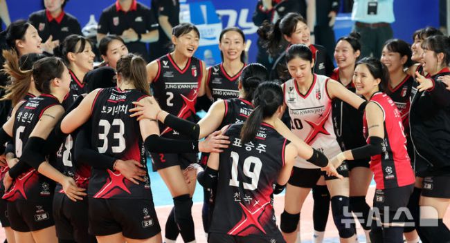 [대전=뉴시스] 강종민 기자 = 4일 대전 충무체육관에서 열린 2024~2025 V-리그 여자부 챔피언결정전 흥국생명 핑크스파이더스와 정관장 레드스파크스의 경기에서 세트 스코어 3:2로 역전승을 거둔 뒤 정관장 선수들이 기뻐하고 있다. 2025.04.04. ppkjm@newsis.com [대전=뉴시스]문채현 기자 = 벼랑 끝에서 살아난 여자배구 정관장의 고