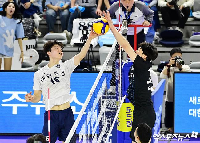 5일 오후 인천 계양체육관에서 열린 '2024-2025 도드람 V-리그' 남자부 챔피언결정전 3차전 현대캐피탈과 대한항공의 경기, 대한항공 정한용의 공격을 현대캐피탈 전광인이 블로킹 시도하고 있다. 박지영 기자 jypark@xportsnews.com