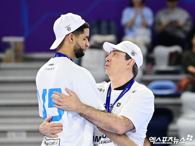 5일 오후 인천 계양체육관에서 열린 '2024-2025 도드람 V-리그' 남자부 챔피언결정전 3차전 현대캐피탈과 대한항공의 경기, 현대캐피탈이 3:1의 세트스코어로 승리하며 다섯 번째 통합우승과 함께 구단 최초 트레블(정규리그 1위·컵대회·챔피언결정전 우승)을 달성했다. 현대캐피탈 블랑 감독이 레오와 포옹을 나누고 있다. 박지영 기자 jypark@xport