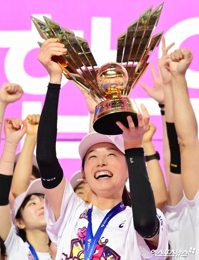 8일 오후 인천 삼산체육관에서 열린 '2024-2025 도드람 V-리그' 여자부 챔피언결정전 5차전 흥국생명과 정관장의 경기, 흥국생명이 정관장에 세트스코어 3:2(26-24 26-24 24-26 23-25 15-13)로 승리하며 통합우승을 차지했다. 통합우승을 차지한 흥국생명 김연경이 기뻐하고 있다. 김한준 기자 kowel@xportsnews.com