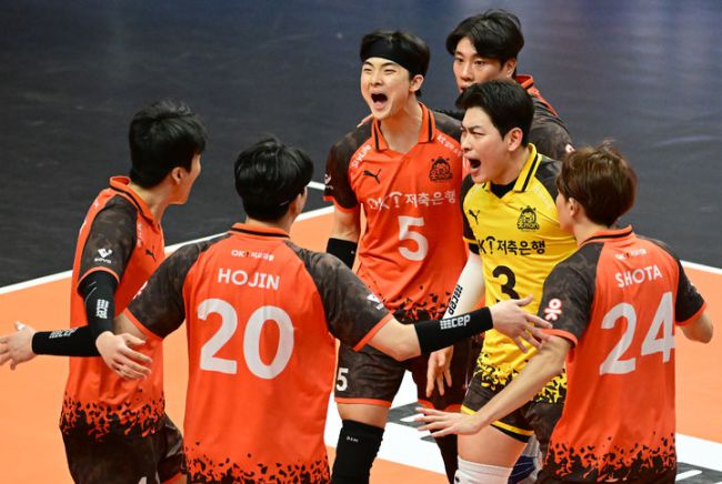 [서울=뉴시스] 프로배구 OK저축은행 선수들이 지난 3월6일 안산상록수체육관에서 열린 도드람 2024~2025 V-리그 남자부 대한항공과의 경기에서 득점에 성공한 뒤 환호하고 있다. (사진=KOVO 제공) 2025.03.06. *재판매 및 DB 금지 [서울=뉴시스]문채현 기자 = 남자배구 OK저축은행이 연고지 이전을 확정했다. 경기도 안산에서 부산으로 떠난