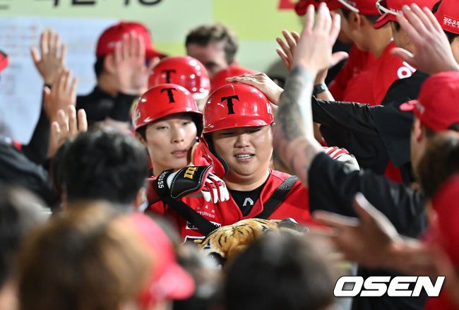 13일 대구삼성라이온즈파크에서 2025 신한 SOL 뱅크 KBO 리그 삼성 라이온즈와 KIA 타이거즈의 경기가 열렸다. 홈팀 삼성은 후라도가, 방문팀 KIA는 올러가 선발 출전했다. KIA 타이거즈 한준수가 8회초 2사 만루 우월 만루 홈런을 치고 하이파이브를 하고 있다. 2025.08.13 / foto0307@osen.co.kr 프로야구 KIA 타이거즈