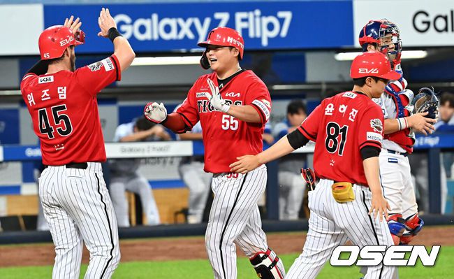 13일 대구삼성라이온즈파크에서 2025 신한 SOL 뱅크 KBO 리그 삼성 라이온즈와 KIA 타이거즈의 경기가 열렸다. 홈팀 삼성은 후라도가, 방문팀 KIA는 올러가 선발 출전했다. KIA 타이거즈 한준수가 8회초 2사 만루 우월 만루 홈런을 치고 하이파이브를 하고 있다. 2025.08.13 / foto0307@osen.co.kr 프로야구 KIA 타이거즈