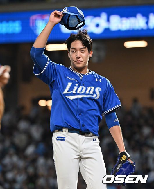 20일 창원NC파크에서 2025 신한 SOL 뱅크 KBO 리그 NC 다이노스와 삼성 라이온즈의 경기가 열렸다. 홈팀 NC는 목지훈이, 방문팀 삼성은 원태인이 선발 출전했다. 삼성 라이온즈 원태인이 6회말 2사 2,3루 NC 다이노스 박건우를 잡고 팬들에게 인사를 하고 있다. 2025.08.20 / foto0307@osen.co.kr 프로야구 삼성 라이온즈의