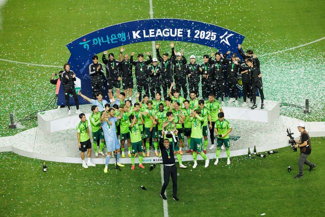 오직 전북 현대만 할 수 있는 챔피언 대관식이다. 우승 트로피 10개가 진열된 가운데 전주성이 팬들의 환호와 녹색 불빛으로 물들었다. 전북 현대는 8일 오후 4시 30분 전주월드컵경기장에서 열린 하나은행 K리그1 2025 36라운드에서 대전 하나시티즌을 3-1로 꺾었다. 일찌감치 조기 우승을 확정한 전북은 승점 75(22승 9무 5패)가 됐다. 후반 11분