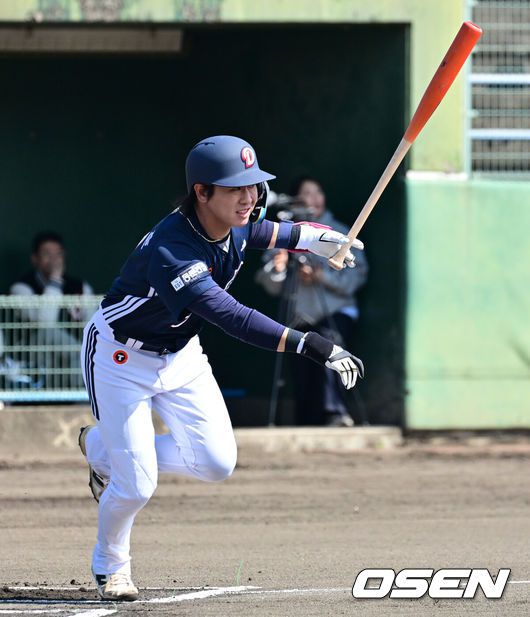 두산 베어스가 1일 일본 미야자키 히사미네 야구장에서 자체 청백전를 가졌다.이날 두산은 팀 훈련이 예정됐지만, 2월 26일 롯데 자이언츠전 3회 우천 노게임에 이어 27일 지바롯데 마린스전까지 우천 취소되면서 실전 감각을 끌어올리고자 청백전이 긴급 편성됐다. 1회초 두산 박찬호가 안타를 날리고 있다. 2026.03.01 /jpnews@osen.co.kr “