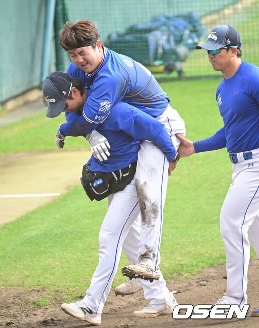 2일 일본 오키나와 킨 베이스볼 스타디움에서 KIA 타이거즈와 삼성 라이온즈의 연습경기가 열렸다. KIA는 양현종, 삼성은 장찬희를 선발로 내세웠다. 6회초 2사 2루 상황 삼성 양우현의 안타 때 주루플레이 중 부상을 입은 삼성 장승현이 트레이닝 코치에게 업혀 경기장을 빠져나가고 있다. 2026.03.02 / dreamer@osen.co.kr 프로야구 삼성