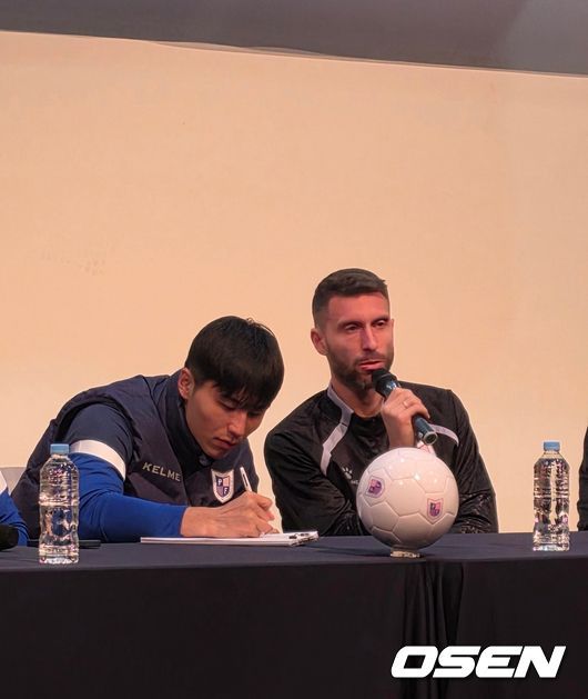 파주 프런티어 FC 기자회견장에 웃음이 번졌다. 스페인 공격수 보르하 바스톤과 주장 홍정운이 만들어낸 유쾌한 에피소드 덕분이었다. 파주 프런티어 FC는 6일 경기도 파주 NFC에서 기자 간담회를 진행했다. 이날 자리에는 황보관 단장과 제라드 누스 감독, 주장 홍정운, 그리고 새로 합류한 공격수 보르하 바스톤이 참석했다. 행사 분위기를 가장 부드럽게 만든 장
