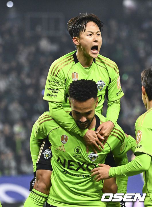 18일 전북 전주월드컵경기장에서 '하나은행 K리그1 2026'전북 현대와 FC안양의 경기가 진행됐다. FC안양은 개막 3경기 무패로 상승세를 이어가고 있고 3위에 랭크됐다. 반면 디펜딩 챔프 전북 현대는 시즌 첫 승을 위해 3전 4기에 도전한다.후반 전북 현대 이승우가 역전골 넣은 모따의 등에 업혀 기뻐하고 있다. 2026.03.18 / soul1014@o