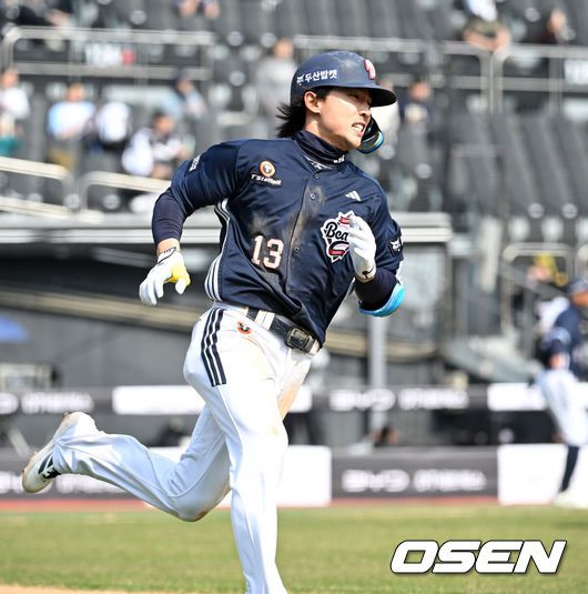 23일 경기도 수원 KT위즈파크에서 ‘2026 신한 SOL KBO리그’ 시범경기 KT 위즈와 두산 베어스의 경기가 열렸다.시범경기는오는 24일까지 각 팀당 12경기씩 총 60경기가 펼쳐진다.5회초 1사 만루에서 두산 이유찬이 좌중간 3타점 적시 2루타를 치고 그라운드를 달리고 있다. 2026.03.23 / sunday@osen.co.kr 23일 경기도 수원