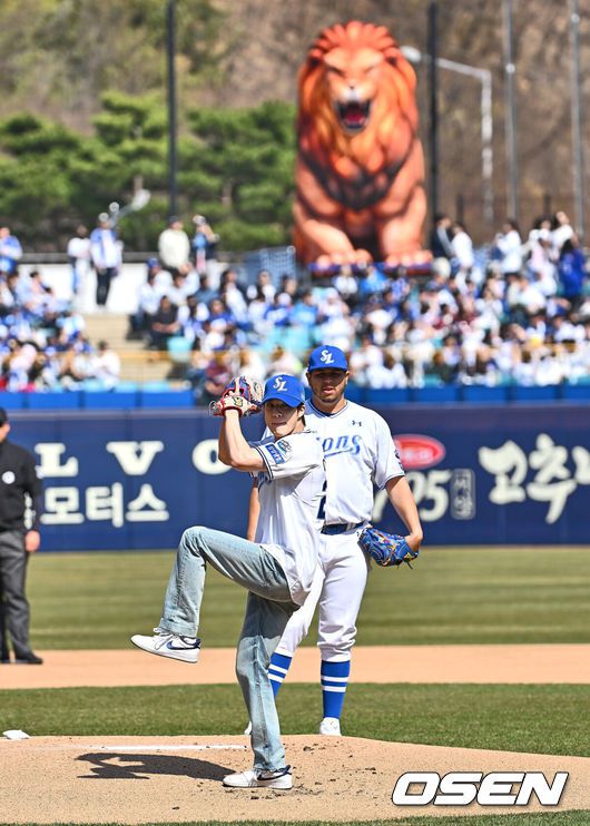 22일 대구삼성라이온즈파크에서 2025 신한 SOL 뱅크 KBO 리그 삼성 라이온즈와 키움 히어로즈의 경기가 열렸다. 홈팀 삼성은 후라도가 방문팀 키움은 로젠버그가 선발 출전했다. NCT 제노가 시구를 하고 있다. 2025.03.22 / foto0307@osen.co.kr 프로야구 삼성 라이온즈의 열성 팬으로 잘 알려진 인기 아이돌 NCT 멤버 제노가 시구