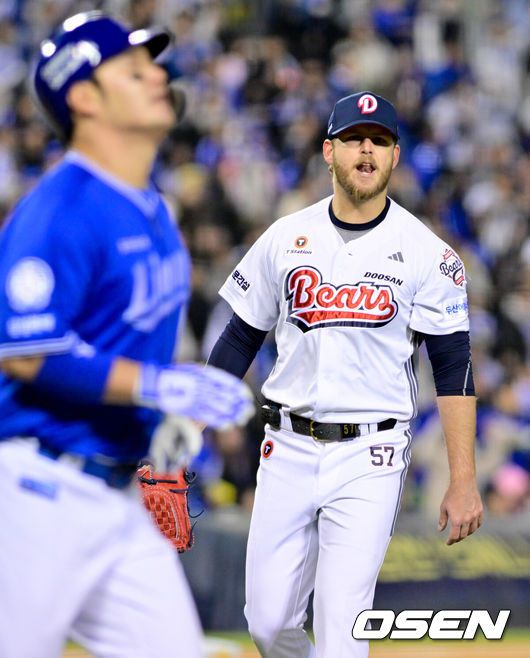 28일 서울 송파구 잠실야구장에서 2025 신한 SOL Bank KBO리그 두산 베어스와 삼성 라이온즈의 경기가 열렸다.이날 홈팀 두산은 콜어빈을, 원정팀 삼성은 후라도를 선발 투수로 내세웠다.7회초 이닝을 마친 두산 콜어빈이 삼성 박병호를 향해 소리치고 있다. 2025.03.28 /cej@osen.co.kr 28일 서울 송파구 잠실야구장에서 2025 신한