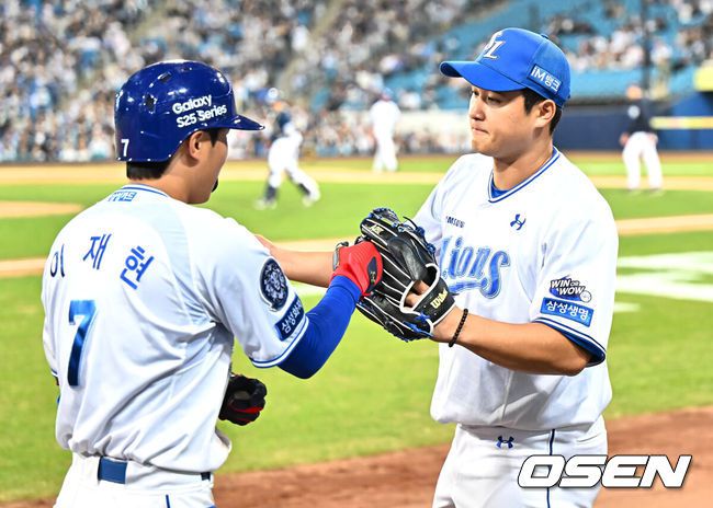 25일 대구삼성라이온즈파크에서 2025 신한 SOL 뱅크 KBO 리그 삼성 라이온즈와 NC 다이노스의 경기가 열렸다. 홈팀 삼성은 최원태가, 방문팀 NC는 최성영이 선발 출전했다. 삼성 라이온즈 이재현이 2회말 2사 1,2루 역전 우월 3점 홈런을 치고 최원태와 하이파이브를 하고 있다. 2025.03.25 / foto0307@osen.co.kr “최원태가