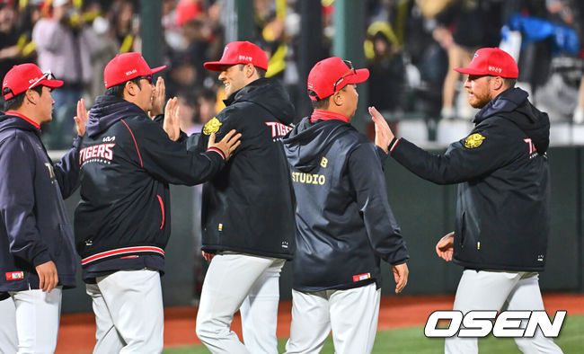 9일 부산 사직야구장에서 2025 신한 SOL 뱅크 KBO 리그 롯데 자이언츠와 KIA 타이거즈의 경기가 열렸다. 홈팀 롯데는 나균안이, 방문팀 KIA는 네일이 선발로 출전했다.KIA 타이거즈 이범호 감독이 롯데 자이언츠에 3-1로 승리한 후 기쁨을 나누고 있다. 2025.04.09 / foto0307@osen.co.kr KIA 타이거즈가 14경기 만에 시