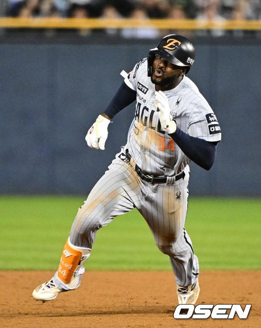 9일 오후 서울 잠실야구장에서 2025 신한 SOL Bank KBO리그 두산 베어스와 한화 이글스의 경기가 열렸다.이날 두산은 콜 어빈, 한화는 폰세를 선발로 내세웠다.5회초 2사 1,2루에서 한화 플로리얼이 동점 2타점 우익수 오른쪽 3루타를 날리고 전력질주를 하고 있다. 2025.04.09 / jpnews@osen.co.kr 9일 오후 서울 잠실야구장에