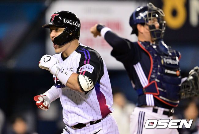 11일 오후 서울 송파구 잠실야구장에서 ‘2025 신한 SOL Bank KBO리그’ LG 트윈스와 두산 베어스의 경기가 열렸다.홈팀 LG는 송승기, 방문팀 두산은 최원준을 선발로 내세웠다.7회말 2사 1,2루 LG 박동원이 재역전 3점 홈런을 날린 뒤 기뻐하고 있다. 4-2로 앞서가는 LG. 2025.04.11 /cej@osen.co.kr 11일 오후 서울