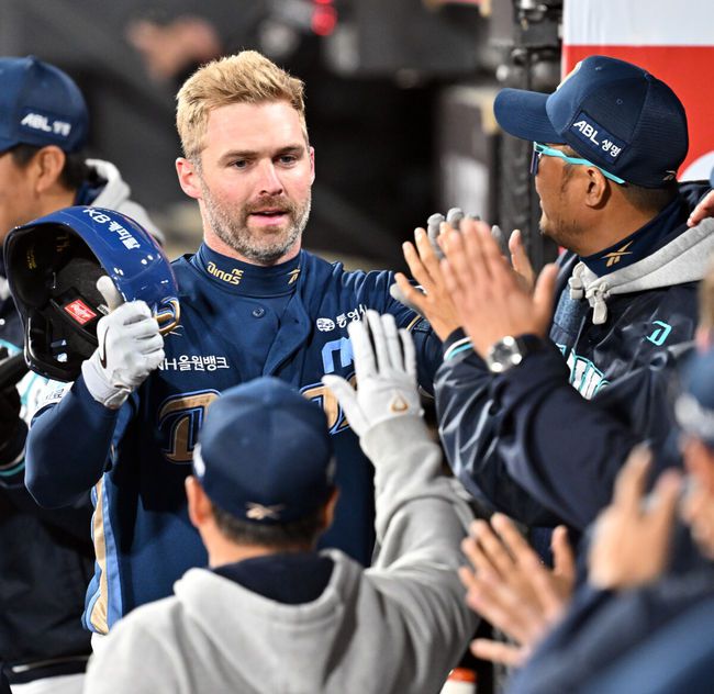 10일 오후 경기도 수원 KT위즈파크에서 ‘2025 신한 SOL Bank KBO리그’ KT 위즈와 NC 다이노스의 경기가 열렸다.홈팀 KT는 오원석, 방문팀 NC는 라일리를 선발로 내세웠다.8회초 2사 1루 NC 데이비슨이 투런포를 날린 뒤 이호준 감독의 환영을 받고 있다. 2025.04.10 /cej@osen.co.kr 2연패에 빠진 NC 다이노스 이호준