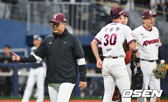 프로야구 키움 히어로즈가 투타 완벽한 조화를 이루며 2연패에서 벗어났다.키움은 22일 서울 고척스카이돔에서 열린 ‘2025 신한은행 SOL Bank KBO리그’ 두산 베어스와의 경기에서 5-4로 승리했다. 이날 승리로 2연패를 끊고 주중 3연전 기선 제압에 성공했다.9회초 키움 홍원기 감독이 마운드에 올라 선수들의 독려한뒤 마운드를 내려가고 있다. 2025